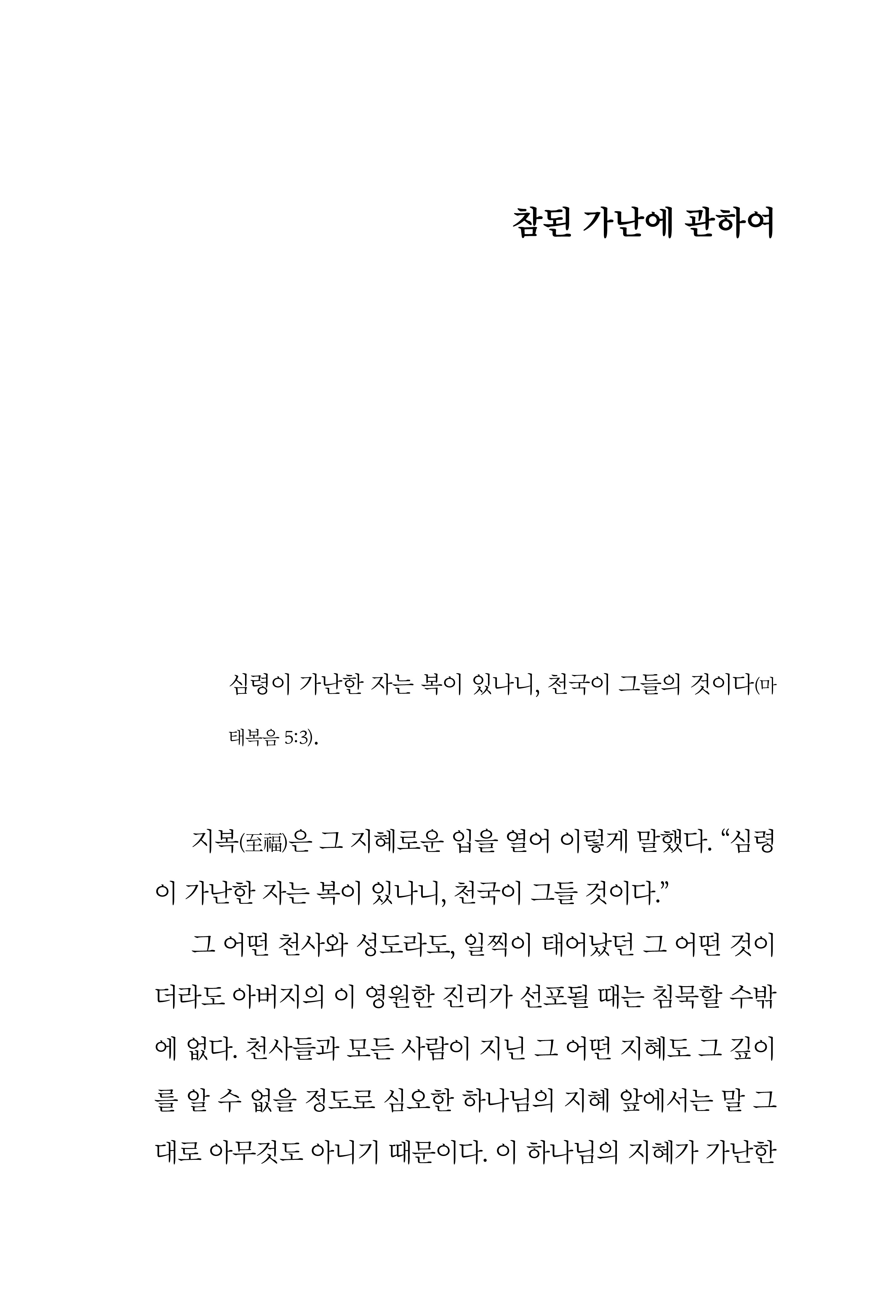 “당신이 하나님의 뜻을 만족시켜드리려는 이런 의지를 갖고 있는 한, 나아가 가령 영원을 갈망하며 하나님 바로 그분을 갈망하는 한, 당신은 진정 가난한 사람이 아니다. 가난한 사람은 다만 그 어떤 것도 바라지 아니하며 그 어떤 것도 인식하거나 갈망하지 아니한다.”