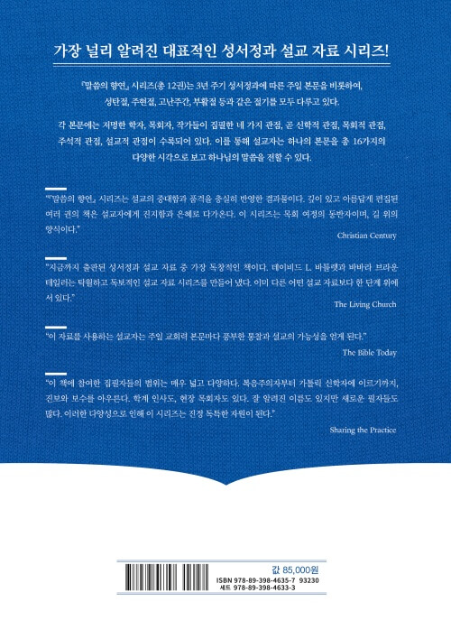 ★ “지금까지 출판된 성서정과 설교 자료 중 가장 독창적인 책이다. 데이비드 L. 바틀렛과 바바라 브라운 테일러는 탁월하고 독보적인 설교 자료 시리즈를 만들어 냈다. 이미 다른 어떤 설교 자료보다 한 단계 위에 서 있다.” -The Living Church