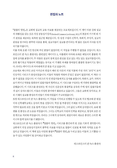 ★ “이 자료를 사용하는 설교자는 주일 교회력 본문마다 풍부한 통찰과 설교의 가능성을 얻게 된다.” -The Bible Today