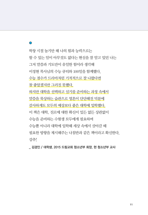 학창 시절 놀기만 해 나의 힘과 능력으로는 할 수 있는 일이 아무것도 없다는 현실을 잘 알고 있던 나는 그저 말씀과 기도만이 유일한 힘이라 생각해 이정현 목사님의 수능 큐티와 100일을 함께했다. 수능 점수가 드라마처럼 기적적으로 잘 나왔다면 참 좋았겠지만 그러진 못했다. 하지만 대학을 선택하고 실기를 준비하는 과정 속에서 말씀을 묵상하는 습관으로 영혼이 단단해진 덕분에 감사하게도 모두의 예상보다 좋은 대학에 입학했다.