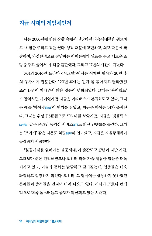 놀라운 지점은 그것이다. 20년 전 저자가 선포하는 메시지를 들었을 때의 열정이 지금까지 하나도 꺼지지 않고 활활 타오른다는 것이다. 그는 17년 전에 썼던 『불꽃시대를 열어가는 불꽃세대』라는 책 제목처럼 달려 왔다. 이제는 혁신으로 세상을 바꿔 가는 사람들을 지칭하는 ‘게임체인저’의 인생을 살아가려 한다. 허공에 맴도는 메시지가 아니라, “얘들아! 5살짜리 손녀를 둔 할아버지 목사도 불꽃같은 꿈을 잃지 않았어! 우리 함께 말씀으로 세상을 바꾸는 하나님나라의 게임체인저가 되어보자!”라고 외치는 선언문이다. 청소년뿐 아니라 하나님나라의 꿈을 꾸고 싶은 분들께 추천한다.