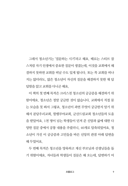 청소년들의 다양한 상황에서 마주하는 질문들은 “시험 기간에도 교회에 꼭 가야 하나요?” “학교 급식 시간에 기도해야 하나요?”와 같은 ‘순한맛’부터 “자살하면 정말로 지옥 가나요?” “동성에게 끌린다는 친구가 있는데, 동성애는 정말 죄인가요?” “가끔 야동을 보는데요, 야동을 보는 게 죄인가요?”라는 ‘매운맛’ 질문까지 가감 없이 담아냈다.
