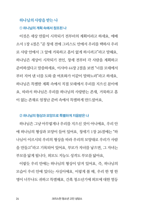 『크리스천 청소년 고민 상담소』는 크게 여덟 파트로 나뉜다. ‘내가 누구인지 알고 싶을 때’, ‘나의 꿈을 찾고 싶을 때’, ‘천국과 구원, 죽음에 대해 묻고 싶을 때’, ‘사랑과 연애가 궁금해질 때’, ‘이런 것도 해도 되는지 묻고 싶을 때’, ‘학교 생활과 관계에 대해 털어놓고 싶을 때’, ‘하나님을 믿다가도 고민과 갈등이 찾아올 때’, ‘성경과 교회에 대해 더 알고 싶을 때’다.