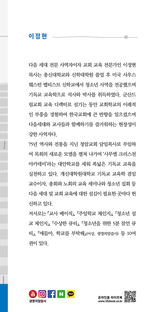 좋은 책을 고르는 기준 중 하나는 ‘누가 썼는가?’입니다. 한 권의 책은 한 사람의 인생을 통과해 나오기 때문입니다. 그런 의미에서 이 책은 청소년은 물론 가슴 속에 청소년을 품은 분이라면 반드시 읽어야 할 책입니다. 이정현 목사님만큼 청소년을 깊이 이해하며 함께 한 사람이 또 있을까요?