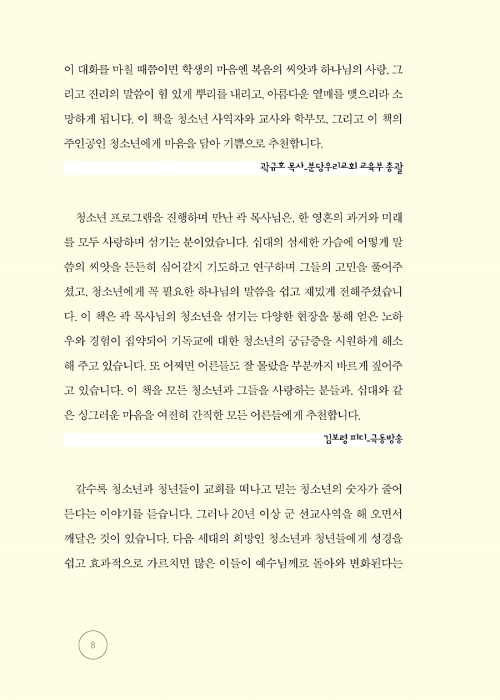 의사가 아픈 사람의 가슴에 청진기를 대 보고 정확하게 진단하듯이 이 책을 통해 청소년의 신앙적 고민과 궁금증에 대해 제대로 듣고 그들을 살리며 세울 수 있다. 재미와 의미, 두 마리의 토끼를 잡고 있는 이 책은 세상과 복음의 갈림길에서 갈팡질팡하는 청소년뿐 아니라 그들을 사랑하는 부모, 교사, 청소년 사역자에게도 무척 유익하다. 신앙에 의심이 생길 때, 믿음의 선택을 해야 할 때, 신앙의 기초를 다지고 싶을 때 이 책을 책장에 꽂아 놓고 언제든 꺼내보면 좋을 것이다. 또 초신자와 경계선 상에 있는 신자를 위한 기독교 입문서로도 손색이 없다.