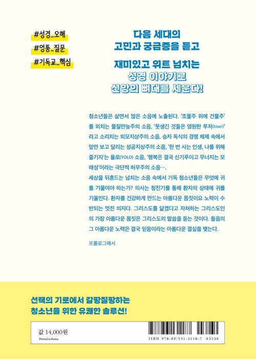 하지만 청소년들이 주님의 음성에 귀를 기울이는 것을 방해하는 장애물이 많다. 성경에 기록된 말씀은 실제 역사와 무관하며 내 삶과는 동떨어진 것이라고 치부해 버리는 생각, 요셉, 모세, 솔로몬, 룻 등 익숙한 성경 인물에 대해 오해하거나 성경 이야기에 심긴 깊은 뜻을 헤아리지 못한 채 신앙생활하는 것이 귀를 차단시킨다. 또 청소년뿐 아니라 어른들도 의외로 주기도문, 사도신경, 십계명을 비롯해 기독교의 기본 교리에 대해 막연하게 알고 있는 경우도 장애물일 수 있다. 가정의 위기가 극에 달했던 혼돈의 청소년기를 하나님의 사랑으로 극복한 저자는 청소년 사역 현장에서 그들과 뒹굴고 소통하며 깨달은 혜안을 이 책에 사랑을 담아 들려준다. 묵직한 주제들이지만 쉽고 위트 넘치는 비유와 스토리를 곁들여 한편의 영화를 보듯 재미있고 흥미진진하게 읽을 수 있다.