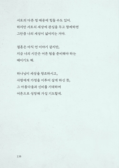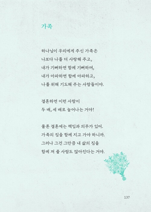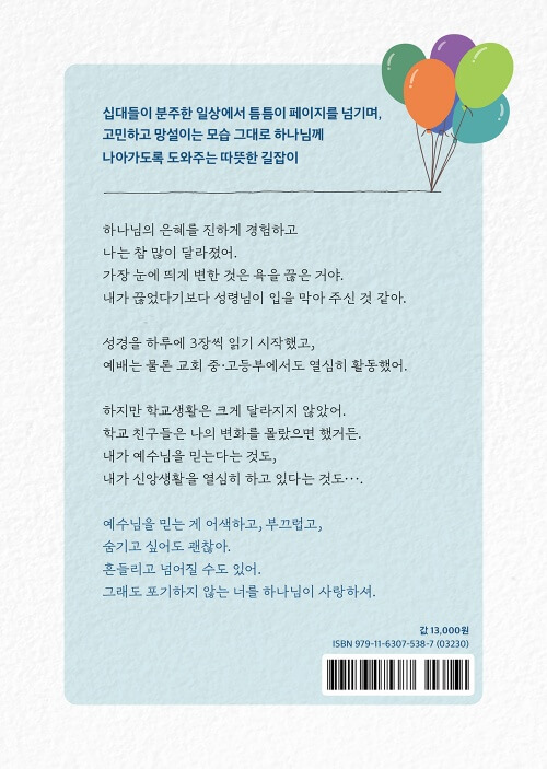 이 책은 십대들이 분주한 일상에서 틈틈이 페이지를 넘기며, 고민하고 망설이는 모습 그대로 하나님의 품에 안기도록 인도해 주는 따뜻한 상담자이자 길잡이가 되어 줄 것이다.