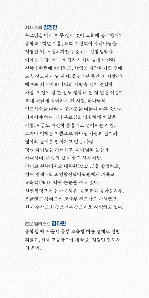 부모님을 따라 교회에 발을 들였지만, 중학교 1학년 여름 수련회에서 하나님을 제대로 만났다고 고백하는 저자는, 그때부터 어리지만 진솔한 마음으로 하나님을 알아가는 영적 여정을 시작했다. 그리고 흔들리고 넘어지는 과정을 거쳐 어른이 되었기에, 불안과 혼란 속에서도 교회 문턱을 넘는 십대들에게 깊은 애정을 품게 되었다. 저자는 이 책에 말씀 연구와 많은 경험으로 응축된 실질적 조언, 사역 현장에서 배운 지혜를 담아 십대들의 신앙 여정을 응원한다.