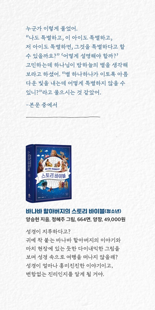 누군가 이렇게 물었어. “나도 특별하고, 이 아이도 특별하고, 저 아이도 특별하면, 그것을 특별하다고 할 수 있을까요?” ‘어떻게 설명해야 할까?’ 고민하는데 하나님이 밤하늘의 별을 생각해 보라고 하셨어. “별 하나하나가 이토록 아름다운 빛을 내는데 어떻게 특별하지 않을 수 있니?”라고 물으시는 것 같았어. 까만 밤하늘에 무수한 별이 빛을 낼 때 숨 막히게 아름다운 광경이 펼쳐지는 것처럼, 우리는 수많은 특별한 사람들과 함께 아름다운 세상을 만들어 가는 거야.-p. 29-30