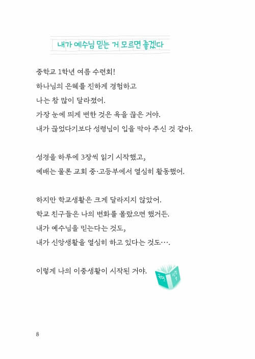 어릴 때부터 교회에 다녔지만, 하나님 안에서 내가 어떤 존재인지 몰랐어. 나는 하나님을 믿으면서도 늘 죄를 짓고 후회하는 사고뭉치였어. 이런 생각은 또 다른 죄와 후회를 낳았어. 감정과 생각은 행동으로 이어지니까. 너는 어떠니? 너 자신을 어떻게 생각하니? 예수님이 정말 좋아서 이전과 다르게 말하고 행동하고 싶은데 그게 너무 안 되면, 너 자신을 어떻게 생각하고 있는지 살펴봐. ‘나는 쓸모없는 사람이야.’ ‘나는 아싸 중에 아싸야.’ 혹시 이렇게 생각하고 있다면 다음 말씀을 찬찬히 읽어 봐.-p. 18