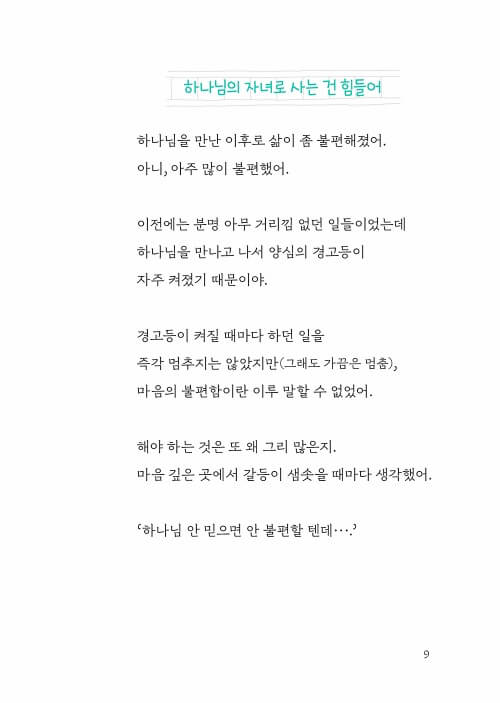 / 내가 예수님 믿는 거 모르면 좋겠다_8/ 하나님의 자녀로 사는 건 힘들어_9/ 어떡하지?_10/ 양다리의 비애_11/ 기적?_12/ 계속 반복되는 죄_13/ 저는 글러 먹었어요_14/ 다들 그렇게 하니까_15/ 너는 어떤 사람이니?_16/ 나란 사람_18/ 형상대로_21/ 나를 위해 지었나니_23/ 숨만 쉴 수 있어도_25/ 특별함_27/ 있음과 없음_31/ 사랑 1_34/ 사랑이란?_39/ 감정과 믿음_40/ 사랑받을 자격?_42/ 인정(인기)_44/ 어찌 보든_47/ Cheer Up!-49/ ‘나’다움_50/ 자유_52/ 자기 사랑_55/ 하나님이 사랑하시듯_57/ 자기부인-59/ 땅 그만 파!_61/ 세상의 소금_64/ 세상의 빛_66/ 구별된 삶_68/ 사랑 2_71/ 갈등_74/ ‘화’라는 감정_75/ 용서_77/ 실망_81/ 토닥토닥_83/ 꿈에 대하여_84/한 번에 한 걸음_86/ 그의 나라_88/ 모두의 꿈_90/ 작은 자_92/ 꿈으로 가는 길_94/ 예수님 옆에서_97/ 더 중요한 것_99/ 꿈_101/ 새로운 삶_102/ 은혜로 의롭게 됨_104/ 회개_107/ 자책과 회개-109/ 대세(代勢)_111/ 거절 연습_113/ 유혹 1_115/ 유혹 2_117/ 유혹 3_119/ 시간 도둑_121/ 이기는 법_123/ 신비_126/ 고난_128/