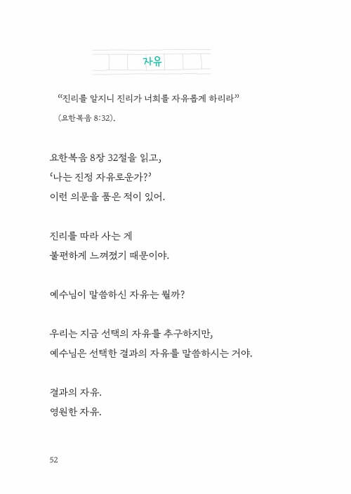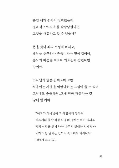 예수님이 말씀하신 자유는 뭘까? 우리는 지금 선택의 자유를 추구하지만, 예수님은 선택한 결과의 자유를 말씀하시는 거야. 결과의 자유. 영원한 자유. 분명 내가 좋아서 선택했는데, 결과적으로 자유를 박탈당한다면 그것을 자유라고 할 수 있을까? 돈을 좇다 죄의 수렁에 빠지고, 쾌락을 추구하다 중독이라는 덫에 걸리며, 분노와 미움을 따르다 외로움에 갇히게 된다면 말이야. 하나님의 말씀을 따르다 보면 처음에는 자유를 억압당하는 느낌이 들 수 있어. 그럼에도 순종하면, 그게 진짜 자유라는 걸 알게 될 거야.-p. 52-53