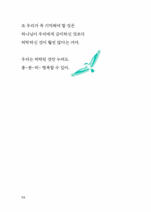 다들 그렇게 하니까 나도 그렇게 하고 싶을 때가 있었어. 약삭빠르게 나 자신만을 위해 행동하고 싶을 때도, 잘못을 인정하고 싶지 않을 때도, 화가 나면 거친 말을 내뱉고 싶을 때도, 해코지당하면 이자까지 얹어 갚아 주고 싶을 때도, 나를 자랑하며 높이고 싶을 때도, 이기기 위해 나쁜 방법을 쓰고 싶을 때도, 더 쉽고 편한 길로 가고 싶을 때도 있었어. 하나님의 말씀대로 살면 나만 손해 보고, 나만 뒤처질 것 같아 불안했던 거야.-p. 15