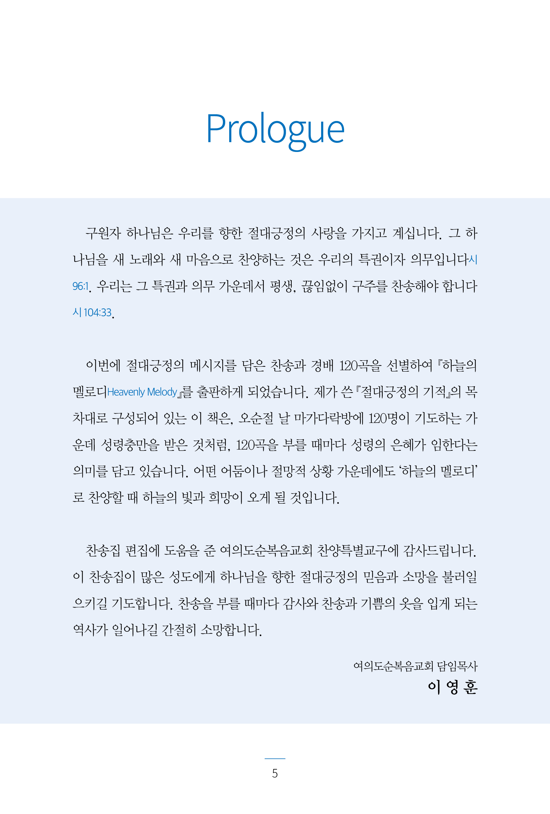 『하늘의 멜로디』는 오랫동안 사랑받아온 찬양과 최근 예배 중 새롭게 불리는 찬양들을 수록했습니다. 찬양은 함께 출간된 단행본 『절대긍정의 기적』의 목차에 따라 주제별로 구성하였고, 찬양을 찾는데 도움을 주고자 책 맨 뒤에 가나다 순서 목차를 추가하였습니다.