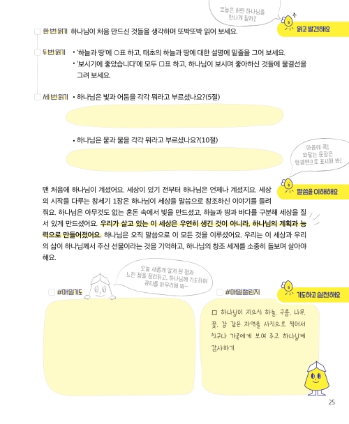 - 기도하고 실천해요: 스스로 기도문을 써서 기도하고, 매일챌린지 미션으로 묵상한 말씀을 생활에서 실천하기