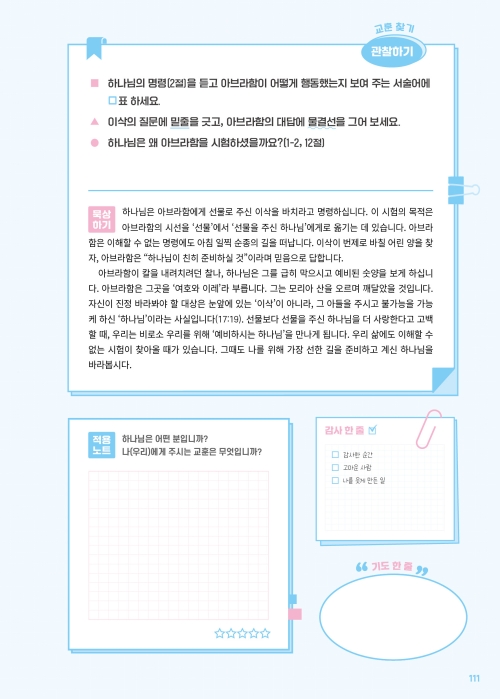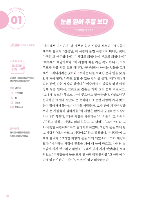 - 주중에 개인적으로 묵상한 말씀을 주일에 교회에서 함께 묵상할 수 있도록, 주일공과교재를 함께 수록해 놓았습니다.