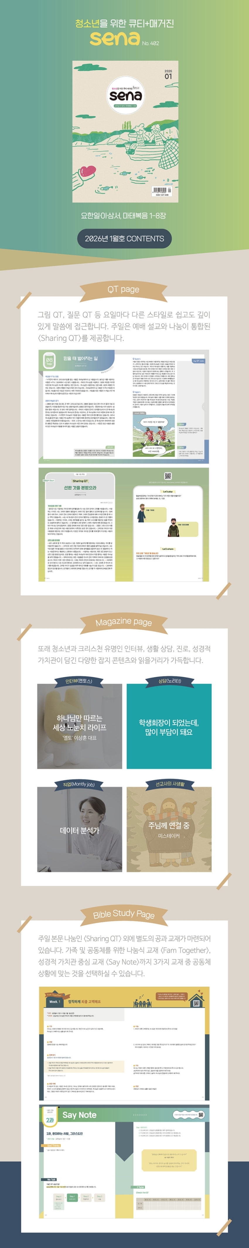 Sena(새벽나라)는 이 땅의 다음세대들이 말씀을 가까이 두고 항상 묵상하며, 신앙과 세상의 문화 사이에서 바른 하나님의 가치관을 갖도록 도와주는 종합 QT 매거진입니다. 청소년의 눈높이에 맞춘 ‘큐티 페이지’, 청소년 또래들의 삶을 나누고 성경적 가치관을 제시하는 ‘매거진 페이지’, 주일 공과로 활용 가능한 ‘교재 페이지’로 다채롭게 구성되어 sena 책 한 권으로 개인 예배와 공동체 예배가 가능합니다.