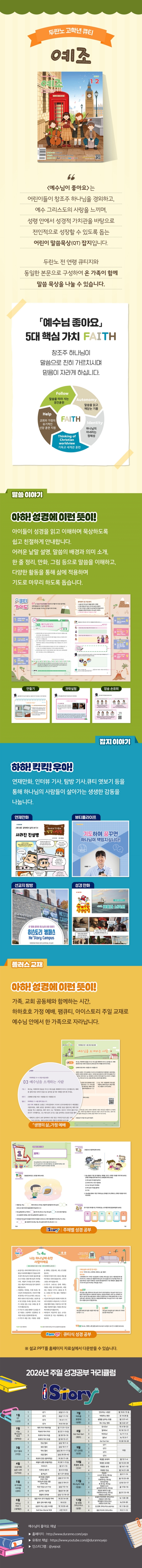 「예수님이 좋아요」는 어린이들이 창조주 하나님을 경외하고, 예수 그리스도의 사랑을 느끼며, 성령 안에서 성경적 가치관을 바탕으로 전인적으로 성장할 수 있도록 돕는 어린이 말씀묵상(QT) 잡지입니다. 두란노 전 연령 큐티지와 동일한 본문으로 구성하여 온 가족이 함께 말씀 묵상을 나눌 수 있습니다.