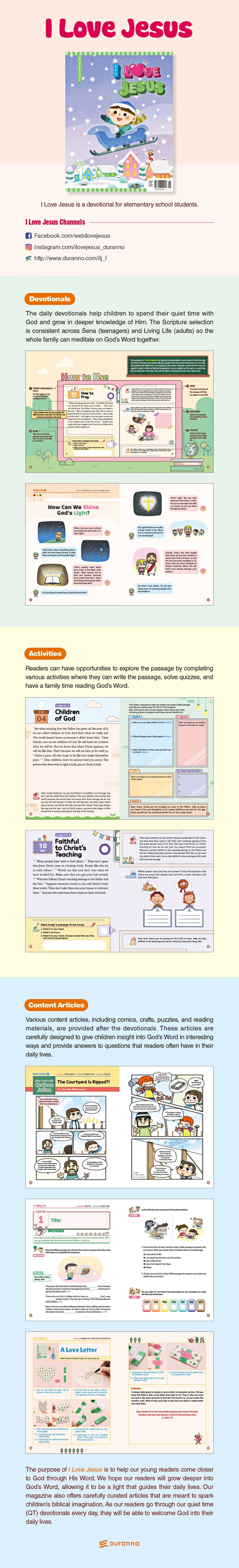 The purpose of I Love Jesus is to help our young readers come closerto God through His Word. We hope our readers will grow deeper into God’s Word,allowing it to be a light that guides their daily lives. Our magazine alsooffers carefully curated articles that are meant to spark children’s biblicalimagination. As our readers go through our quiet time (QT) devotionals everyday, they will be able to welcome God into their daily lives.