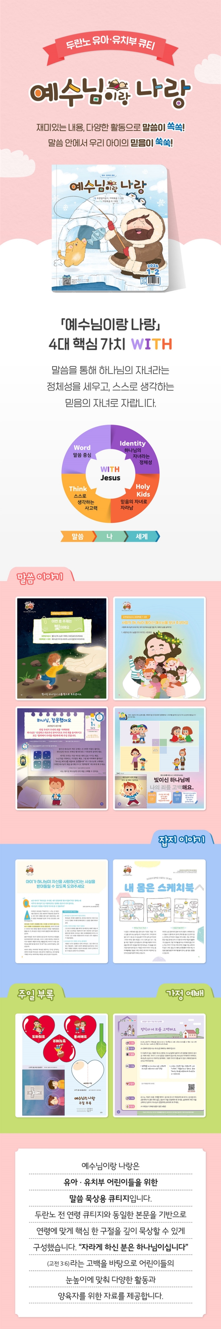 「예수님이랑 나랑」은 유아·유치부 어린이들을 위한 말씀 묵상용 큐티지입니다. 두란노 전 연령 큐티지와 동일한 본문을 기반으로 연령에 맞게 핵심 한 구절을 깊이 묵상할 수 있게 구성했습니다. “자라게 하신 분은 하나님이십니다”(고전 3:6)라는 고백을 바탕으로 어린이들의 눈높이에 맞춰 다양한 활동과 양육자를 위한 자료를 제공합니다.