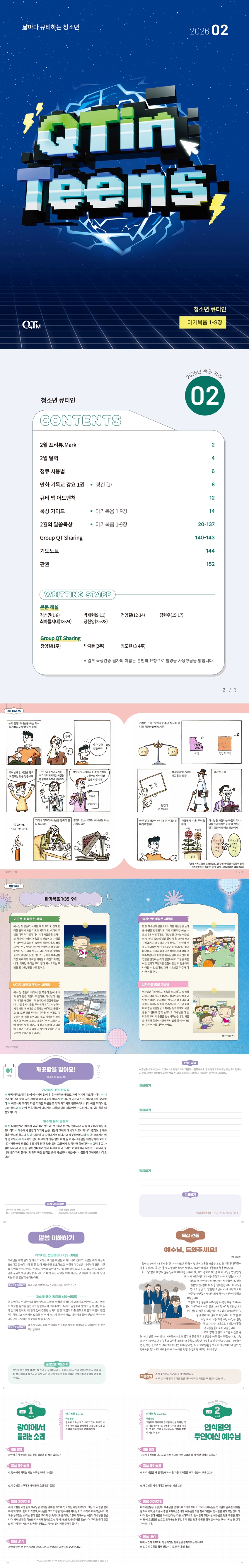 존 칼빈의 『기독교 강요』를 만화로 쉽고 흥미롭게 풀어낸 <만화 기독교 강요>, 성경 속 인물의 이야기를 따라 암호 퀴즈를 풀어보는 <큐티 맵 어드벤처>, 한 달 묵상 본문의 흐름과 핵심 주제를 한눈에 정리해 주는 <묵상가이드> 등 청소년의 관심사를 성경적 가치관으로 담아낸 잡지 기사로, 큐티를 지루해할 수 있는 독자에게 다양한 즐거움을 선사합니다.