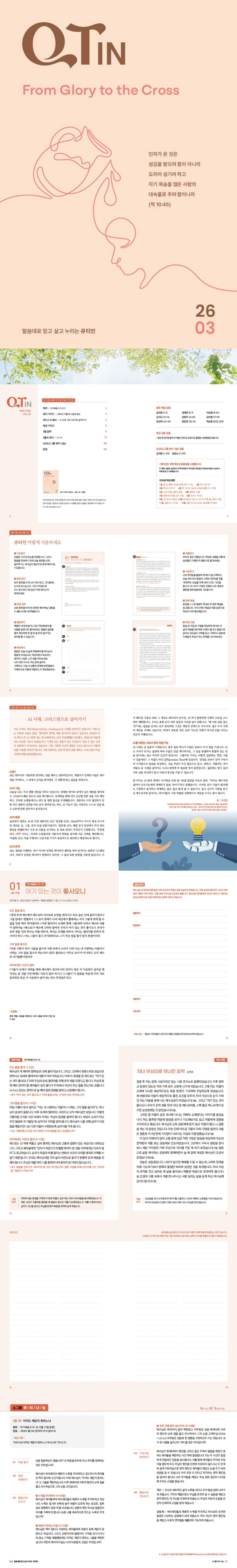 해당 호에 실린 성경본문에 대한 전반적인 이해를 돕는 <묵상 가이드>, 크리스천으로서 AI 시대를 지혜롭게 살아가는 방법을 제시해주는 <큐티人의 信AI> 등을 통해 성도의 영적 성장을 돕습니다.