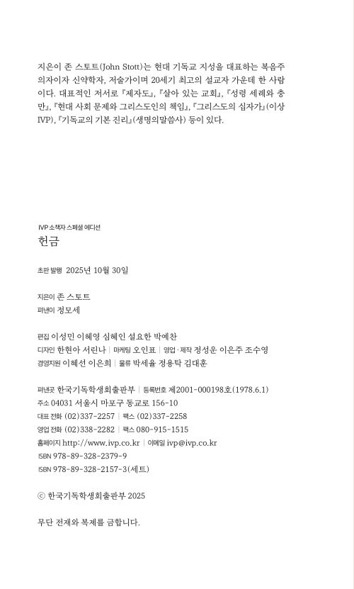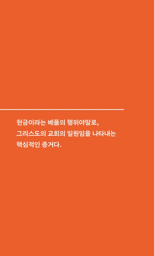 『헌금』에서 존 스토트는 고린도후서에서 바울이 제시하는 헌금의 열 가지 원리를 상세히 해설한다. 헌금은 그리스도인의 여러 의무 중 하나가 아니라, 그리스도의 몸 된 교회의 일원임을 드러내는 핵심 증거다. 사도 바울에게도 헌금은 결코 세속적이거나 주변적인 일이 아니었으며, 심원한 삼위일체 신학과 연결된 성도의 핵심적인 사역이었다. 넉넉히 베푸는 삶은 곧 급진적인 제자의 삶이며, 바울과 저자는 한목소리로 이러한 삶을 살도록 촉구한다.