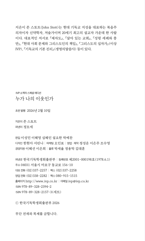 『누가 나의 이웃인가』에서 존 스토트는 복음 전도와 사회 참여 중 무엇이 더 우선인가라는 우문에, 예수님의 삶을 들여다보자는 현답을 던진다. 올바로 보고, 동정하여, 적절한 행동으로 필요를 채워 준 예수님의 모범을 따라 우리도 그와 같이 행할 것을 촉구하며, 영적·물질적·사회적 측면을 모두 아우르는 섬김의 중요성을 역설함으로써 총체적인 이웃 사랑의 삶으로 우리를 초대한다.