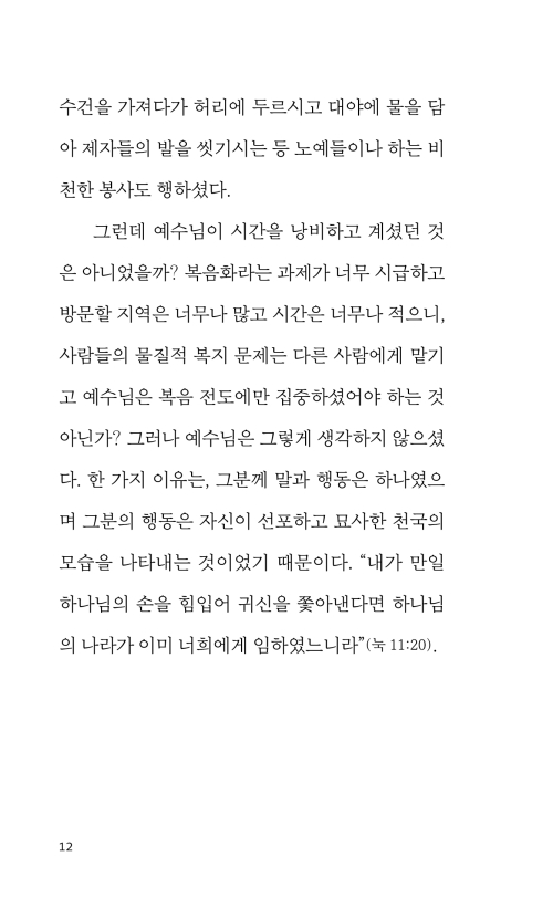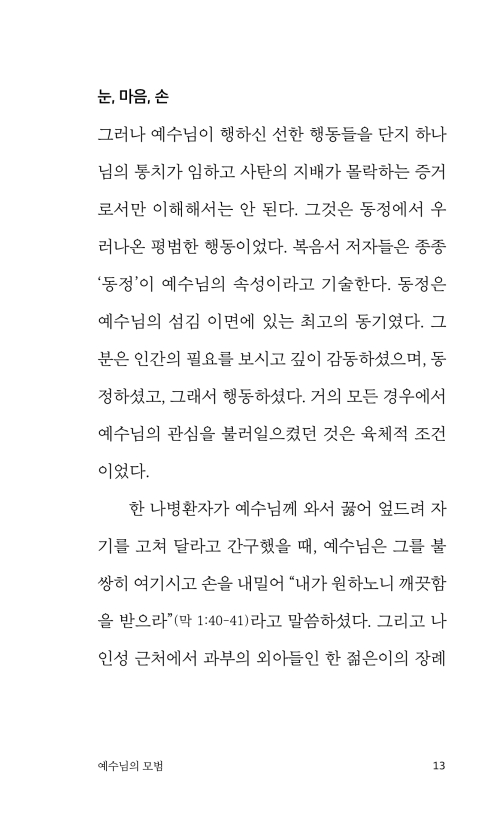 예수님은 진실로 “보셨다.” 그분은 추한 실재 가운데 있는 인간의 궁핍함에 직면하는 것을 두려워하지 않으셨다. 그분이 보신 것은 반드시 그분을 움직여 마음에 동정심을 일으켰으며, 그래서 그분은 동정 어린 섬김을 행하셨다. 때로 그분은 말씀하시기도 했다. 그러나 그분의 동정이 말로만 그쳐 버린 적은 결코 없었다. 그것은 행동으로 표현되었다. 그분은 보셨으며, 느끼셨으며, 행동하셨다.