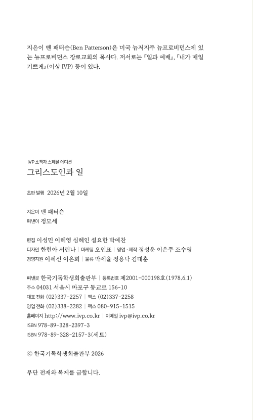 『그리스도인과 일』에서 벤 패터슨은 일과 소명을 새로운 눈으로 바라보게 한다. 일이란 단지 생계를 유지하기 위해 마지못해 해야 하는 거룩하지 못한 것이 아니라, 하나님이 주신 기쁨과 성취를 누리는 통로다. 저자는 하나님이 인간에게 주신 일의 의미를 청지기 개념을 통해 고찰하고, 거룩한 소명으로서 일의 개념을 회복할 것을 촉구한다. 진로를 고민하는 청년들과 자신의 일에서 의미를 찾기 원하는 그리스도인들에게 도전을 줄 것이다.