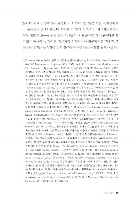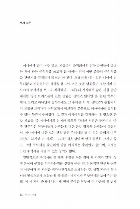 구약성경의 예언서들 가운데서, 탁월한 문체와 은유, 우리의 눈길을 사로잡는 이스라엘의 거룩하신 이에 관한 묵시, 하나님이 장차 이스라엘과 세계를 회복하실 것에 관한 만화경 같은 다채로운 묵시로 구성된 이사야서에 필적한 만한 것은 없다. 구약성경에서 이사야서의 목소리는 시편 다음으로 신약성경 전체에 걸쳐 곳곳에서 아주 강력하게 울려 퍼진다. 신약성경의 기자들과 히에로니무스 이래의 기독교 주석자들이 인정해왔듯이, 이사야서는 이스라엘의 전승들을 활용해서 복음을 말하고 있기 때문이다. 놀랍게도 최근에 이사야서에 대한 복음적인 석의를 기반으로 한 주석서들은 아주 드물게 나와서 극소수에 불과했는데, 이제 30년 넘게 이사야서를 연구하며 가르쳐온 저자가 이사야서에 대한 풍부한 주석과 관점을 담은 주석서를 내놓았다. 모티어의 강조점은 이사야서 본문의 문법적이고 역사적이며 구조적이고 문학적이며 신학적인 차원들에 두어져 있지만, 그는 이사야서가 오늘날 그리스도인들에게 지니는 의미를 염두에 두고서 그런 차원들을 다루고 있다. 저자는 이사야서의 히브리어 본문에 대한 지식을 토대로 해서 이 주석서를 썼지만, 영역 성경인 NIV을 활용함으로써, 성경 히브리어에 대한 지식이 없는 독자들도 쉽게 읽을 수 있게 하였다. 설교자들과 교사들과 온갖 유형의 진지한 성경 연구자들은 이 주석서가 이사야의 예언에대한 지혜롭고 매력 넘치며 반가운 지침서라는 것을 발견하게 될 것이다.