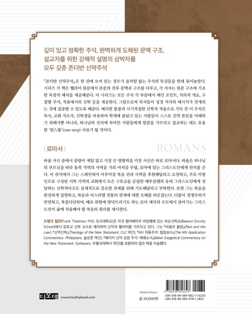 설교자가 반드시 알아야 할 전후 문맥을 잘 연구해놓은 것과 본문의 흐름을 명확하게 알 수 있도록 도표로 본문을 배열해놓은 점 그리고 헬라어에 능숙하지 않아도 충분히 의미를 이해할 수 있도록 배려한 점이 돋보인다. 만일 어느 설교자가 현존하는 우리말 주석 가운데 오직 한 권만 구입해야 한다면 나는 이 주석 시리즈가 될 것이라 확신한다. 신약을 깊고 올바르게 설교하려는 모든 설교자에게 이 시리즈를 추천한다. 설교자라면 반드시 서재에 비치하고 두고두고 보아야 할 주석이다.
