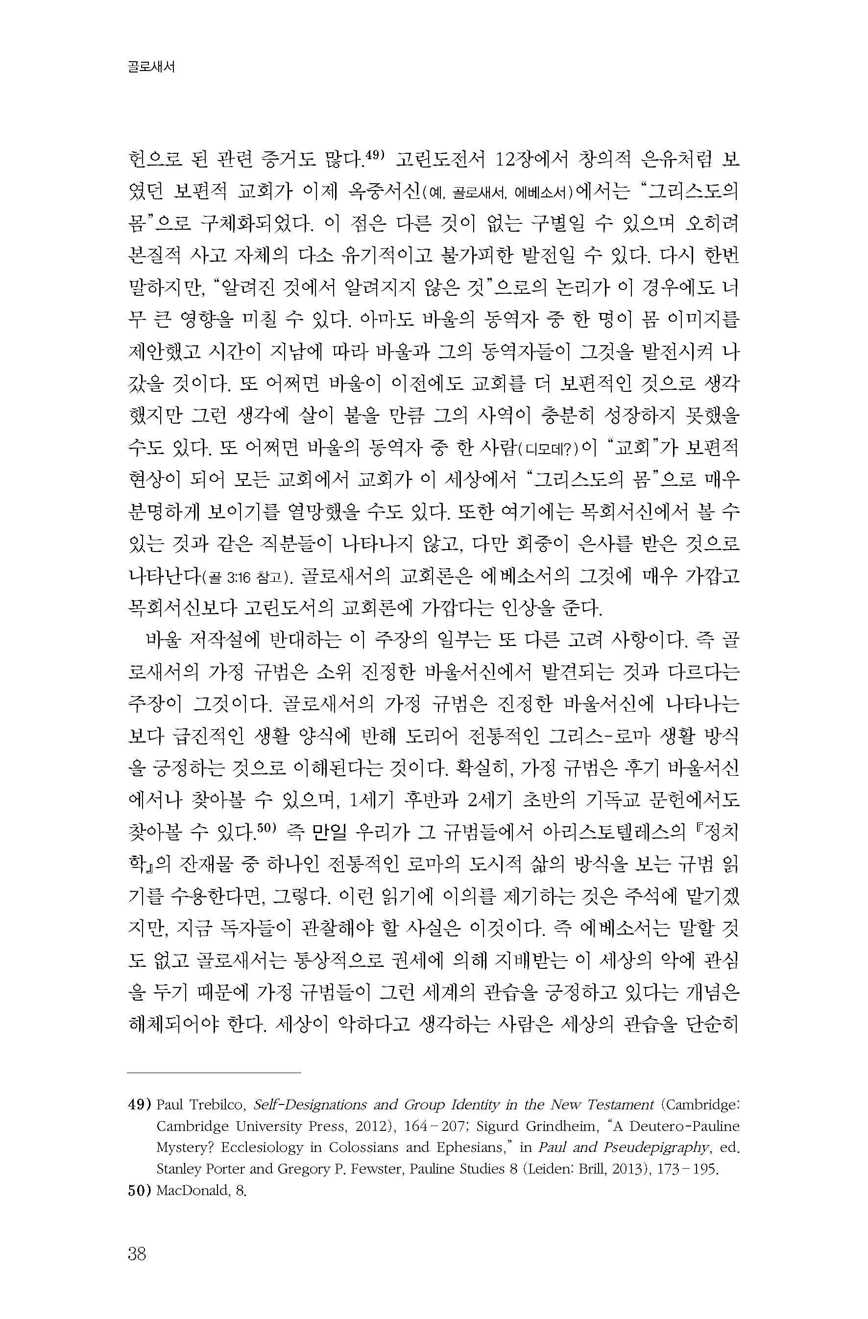 이 편지의 주석에 관한 한, 바울의 문법과 구문을 비교할 수 없을 정도로 치밀하게 읽었다는 점에서 머리 해리스의 『골로새서와 빌레몬서』 주석보다 더 강력히 추천할 수 있는 책은 없다. 나는 헬라어 성경 주석학 교수로서, 찰스 모울과 에두아르트 로제의 주석을 주의 깊게 검토했고 거기서 많은 도움을 받았다. 이 주석을 쓰면서 나는 세 교수가 골로새서 주석을 출판했고(해리스, 던, 무), 트리니티 복음주의 신학교의 나의 두 “후계자”(파오, 캠벨)도 주석을 펴냈다는 사실을 끊임없이 인지하고 있었다. 이제 골로새서에 대한 6개 주석이 같은 기관에서 나왔다는 사실은 이 편지가 주석 교육과정에서 차지하는 위치를 보여 준다.