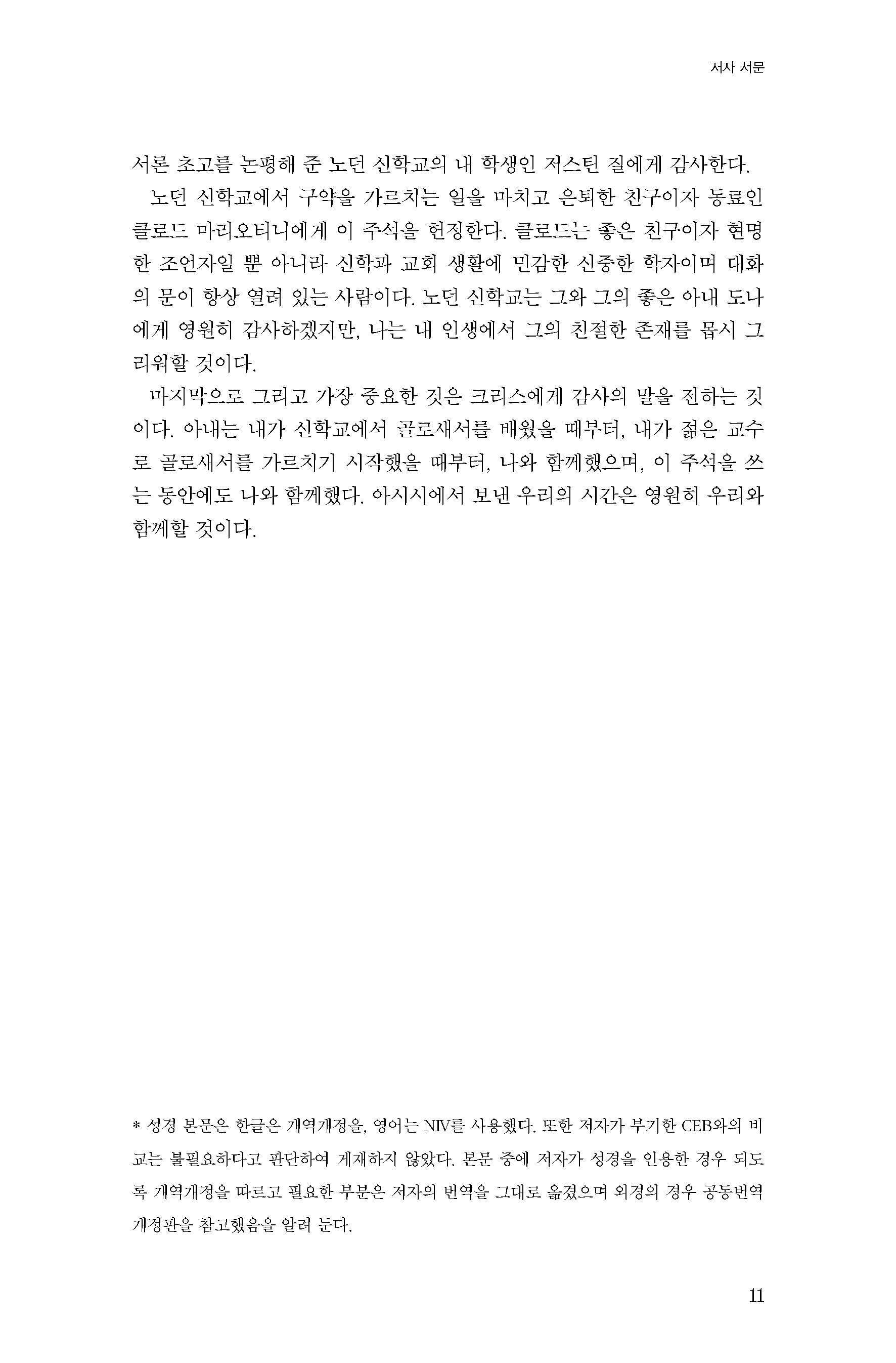1980년대 초에 내가 신학교 학생들에게 헬라어 성경 주석을 가르치기 시작했을 때 가장 먼저 살펴본 책 중 하나가 골로새인들에게 보낸 바울의 편지였다. 첫 상처가 제일 깊은 법이듯, 첫 번째 주석 수업도 내게 가장 깊은 인상을 남겼다. 나는 골로새서 강좌가 개설되지 않는 학부에서 직책을 맡을 때까지 이후 십여 년 동안 거의 매년 골로새서를 가르쳤다. 골로새서 주석을 써달라는 존 팟의 초대를 받았을 때(빌레몬서에 대한 별도 주석과 함께), 나는 그 제안에 더할 나위 없이 흥분했다. 편집자로서 조엘 그린의 능력은 전설적일 뿐 아니라 충분히 그럴 만한 가치가 있다. 첫 번째 초안에 대한 그의 논평을 통해 본 주석은 심층 수정을 거쳐 여러 면에서 개선되는 결과로 이어졌다. 학문 연구 과정에는 깊은 추억이 쌓이는 법인데, 그 추억 중 하나가 조엘과 전 과정을 함께했던 여행이었다. 조엘은 자신의 박사 과정 학생들에게 작업을 맡겨 본 시리즈의 새로운 지침과 각주가 일치되도록 했다. 트레버 톰슨의 탁월한 편집 작업으로 이 모든 것이 제대로 형태를 잡았다.