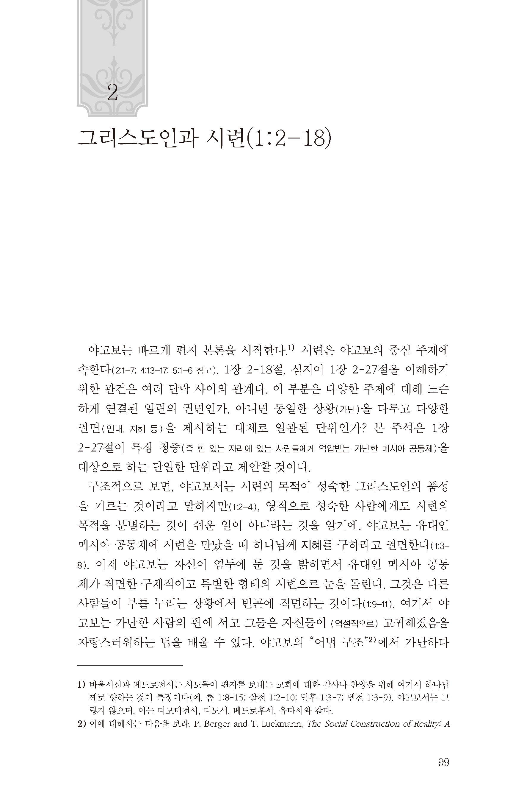 스캇 맥나이트가 쓴 이 주석은 우리를 자주 성가시게 한 야고보서를 고유의 배경 가운데 그리고 고대 유대교와 그리스 로마 세계와 도래할 기독교 신앙의 배경 가운데 해설한다. 맥나이트는 활용 가능한 최고의 학문적 저술과 상호 소통하면서 우선 야고보서 본문에 깊이 들어가서 야고보의 가르침을 야고보가 야고보서 다른 곳에서 말한 것에 비추어 철저하게 따진다. 이 작업은 외적 논란이나 이론으로 야고보서를 질식시키는 방법을 완전히 벗어난 것이다. 이 책은 처음부터 끝까지 목회자와 설교자와 교사를 염두에 두고 집필했으며 통찰과 선한 감성과 위트로 가득하여 회중과 학생에게 야고보서를 설명하고 그 의의를 알려 주기 원하는 모든 이에게 조명을 제공할 것이다.