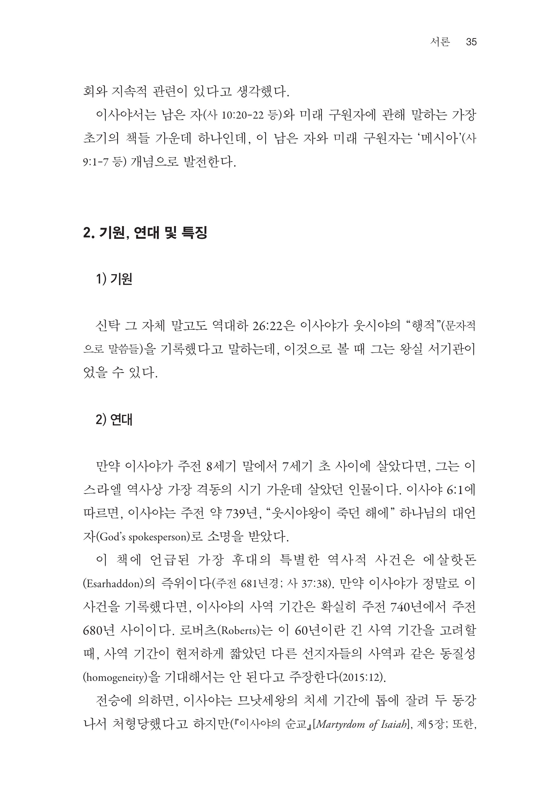 저자는 서문에서 “이사야는 종종 왕과 그의 백성을 직접 겨냥한 메시지를 전한 탁월한 선지자이다. 그는 권력이나 거짓 신들에 대해 잘못된 믿음을 바로 잡는 데 지치지 않았다. 이것은 오늘날 우리에게 여전히 필요한 메시지이다”라고 엄중하게 제언한다.