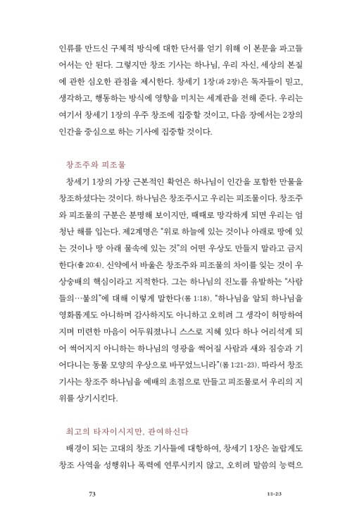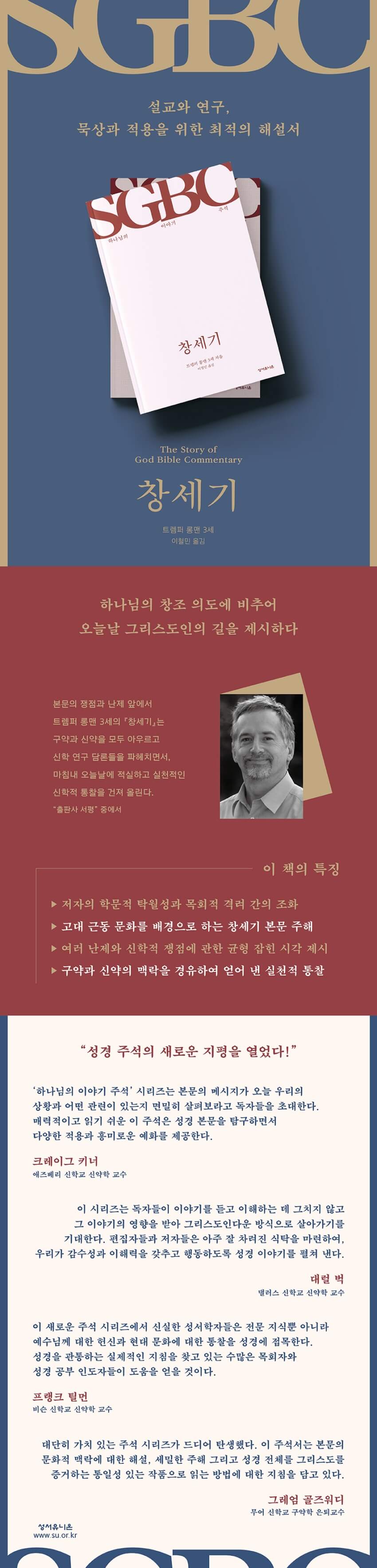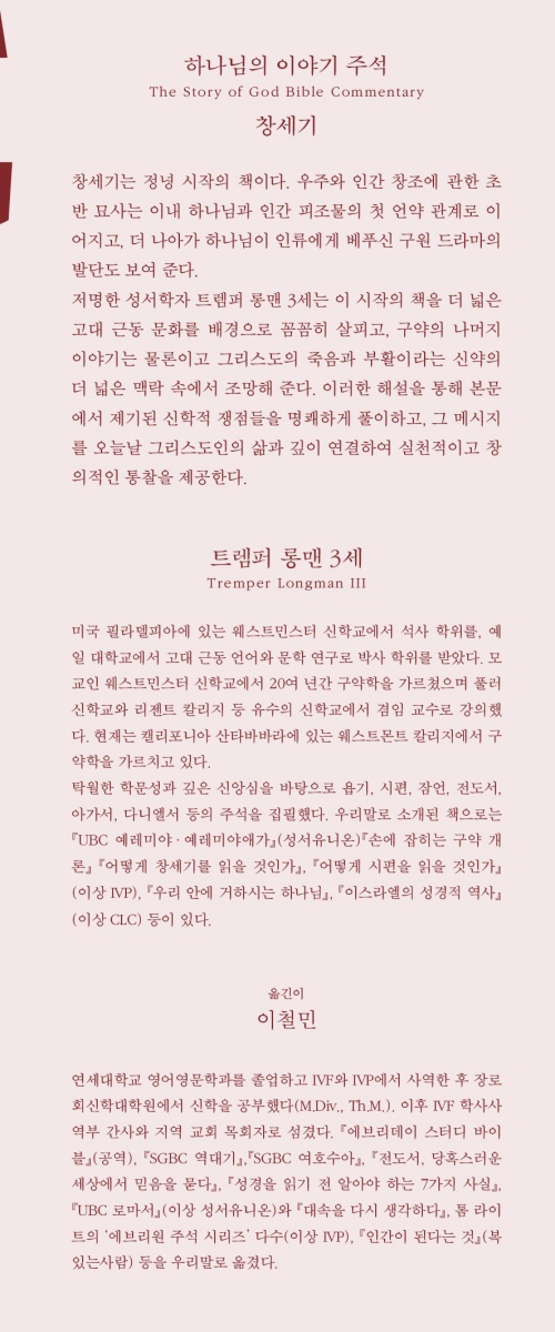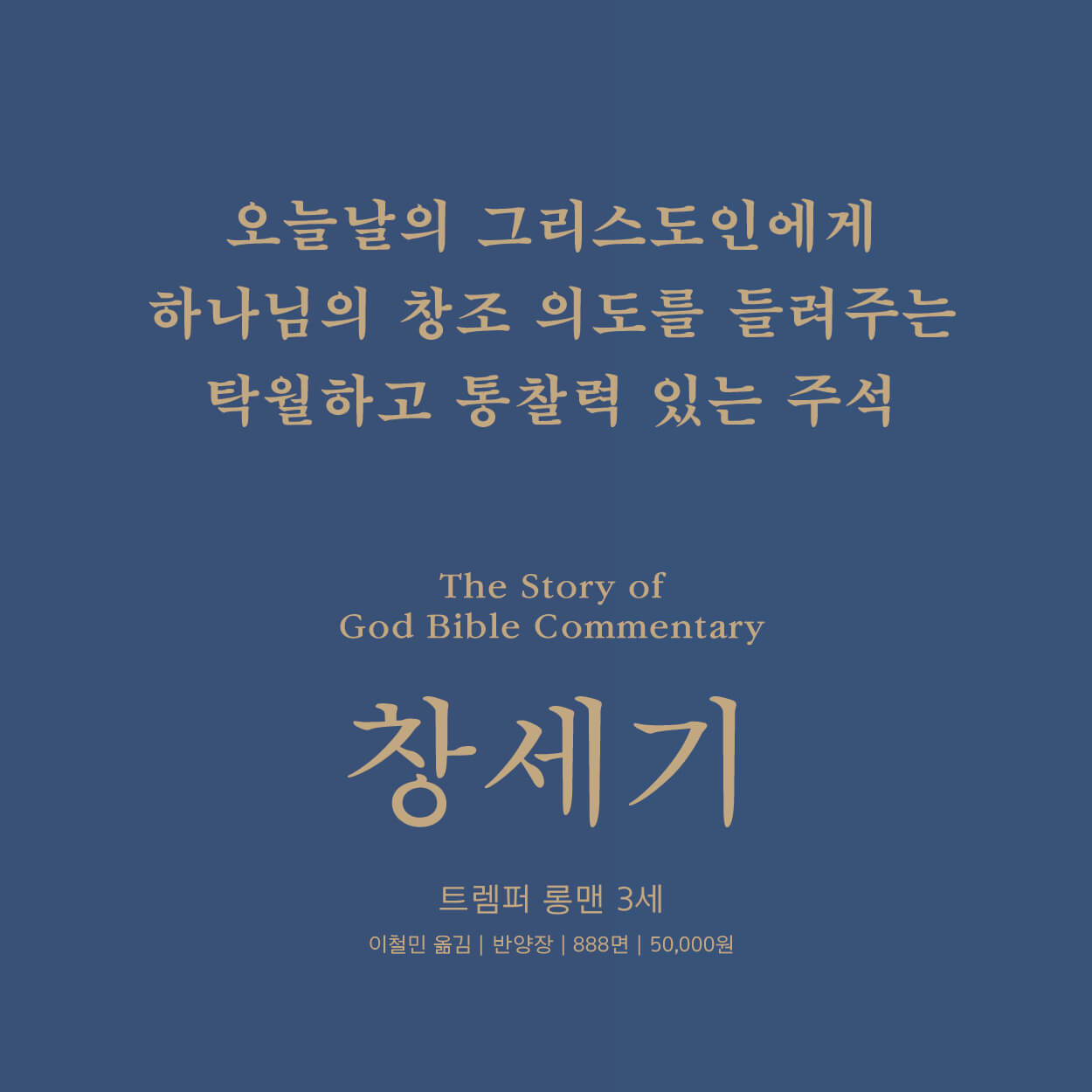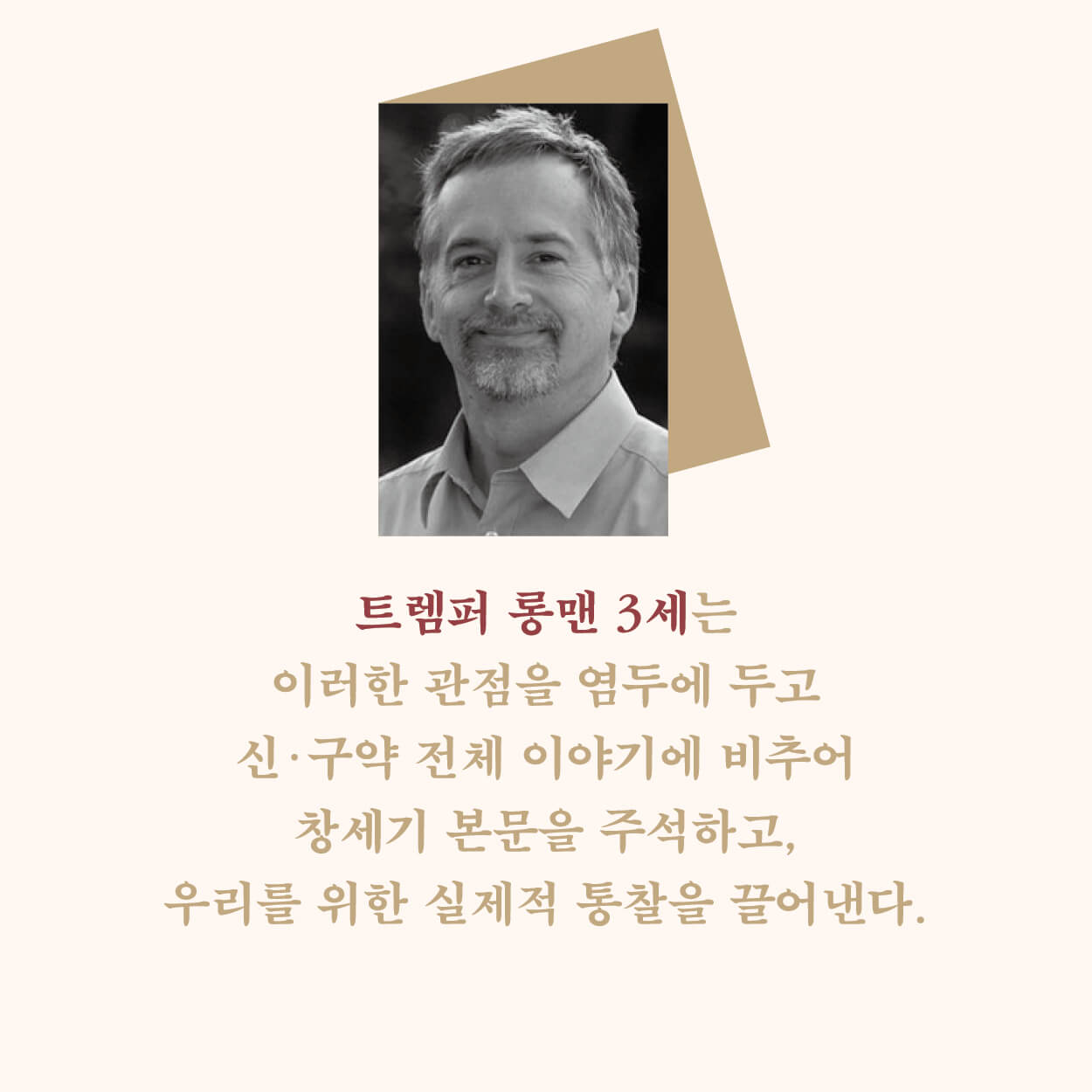 트렘퍼 롱맨 3세는 이 시작의 책을 고대 근동 문화를 배경으로 꼼꼼히 살피고, 구약의 나머지 이야기는 물론이고 그리스도의 죽음과 부활이라는 신약의 더 넓은 맥락 속에서 조망해 준다. 이러한 해설을 통해 본문에서 제기된 신학적 쟁점들을 명쾌하게 풀이하고, 그 메시지를 오늘날 그리스도인의 삶과 깊이 연결하여 실천적이고 창의적인 통찰을 제공한다.