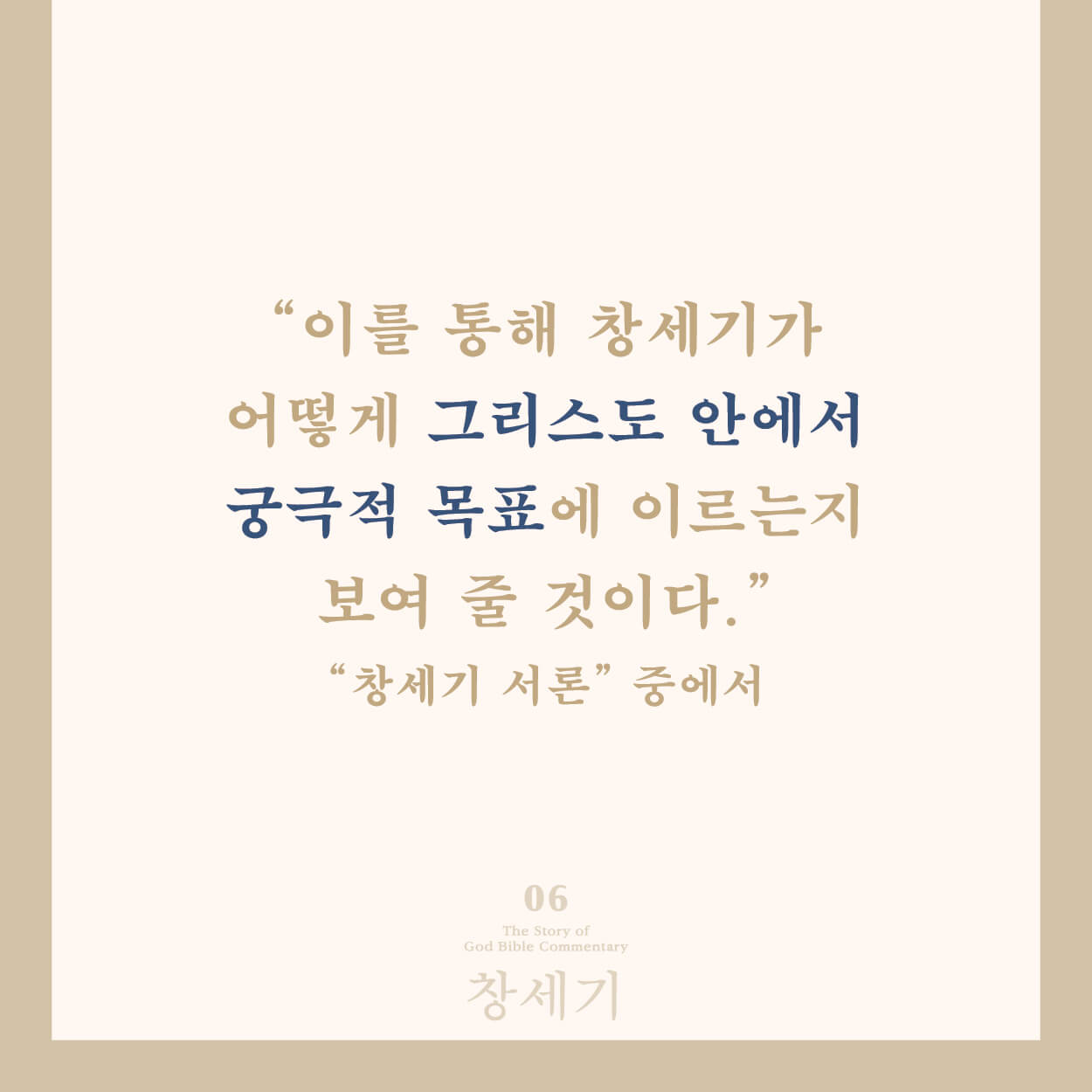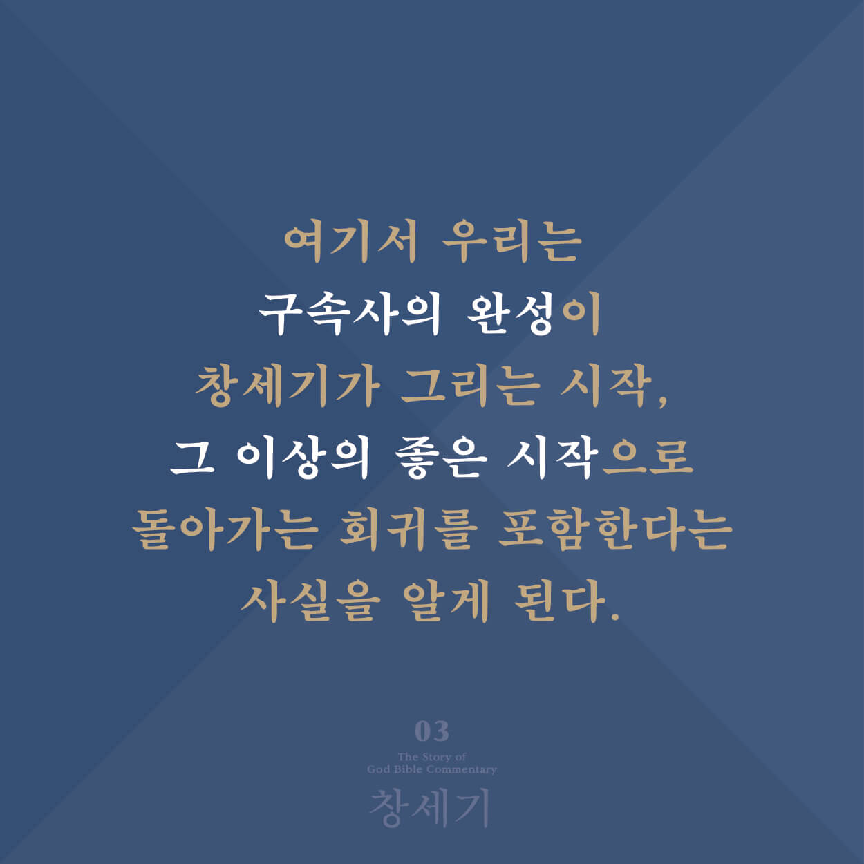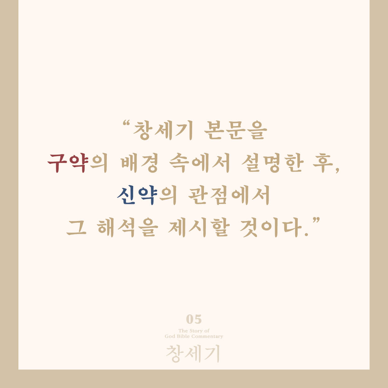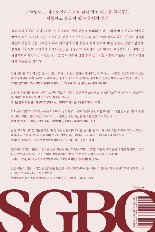 구속사의 완성을 새 예루살렘에 빗대어 묘사하는 요한계시록 22장에서 우리는 두 그루의 생명나무를 만난다(계 22:2). 이 그림은 창세기 처음 장들의 배경인 에덴에서의 생명나무를 떠올리게 한다(창 2:9). 이것은 구속사의 완성이 창세기가 그리는 시작, 그 이상의 좋은 시작으로 돌아가는 회귀를 포함한다는 사실을 알려 준다. 또한 우리는 창세기에 나타난 하나님의 창조 의도가 완성을 향해 나아가는 지금 이 시점에도, 우리가 나아가야 할 방향을 가리키며 여전히 유효한 메시지를 말해 준다는 사실을 깨닫는다. 하나님의 창조 의도가 지금 우리에게 전하는 메시지는 무엇인가? 본문의 쟁점과 신학적 난제 앞에서 ‘하나님의 이야기 주석’ 『창세기』는 구약과 신약을 모두 아우르고 신학 연구 담론들을 파헤치면서, 마침내 오늘날에 적실하고 실천적인 신학적 통찰을 건져 올린다.
