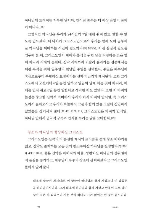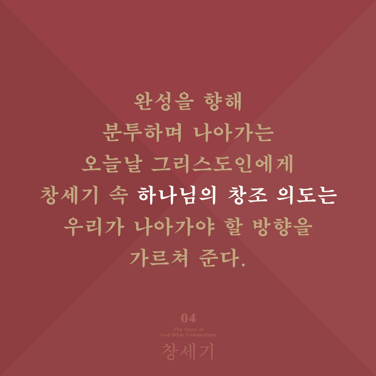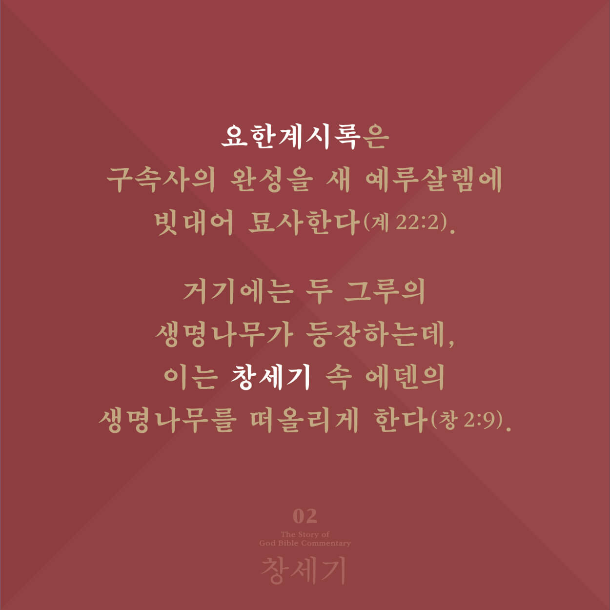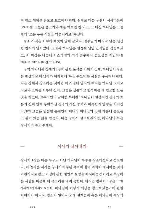 구속사의 완성을 새 예루살렘에 빗대어 묘사하는 요한계시록 22장에서 우리는 두 그루의 생명나무를 만난다(계 22:2). 이 그림은 창세기 처음 장들의 배경인 에덴에서의 생명나무를 떠올리게 한다(창 2:9). 이것은 구속사의 완성이 창세기가 그리는 시작, 그 이상의 좋은 시작으로 돌아가는 회귀를 포함한다는 사실을 알려 준다. 또한 우리는 창세기에 나타난 하나님의 창조 의도가 완성을 향해 나아가는 지금 이 시점에도, 우리가 나아가야 할 방향을 가리키며 여전히 유효한 메시지를 말해 준다는 사실을 깨닫는다. 하나님의 창조 의도가 지금 우리에게 전하는 메시지는 무엇인가? 본문의 쟁점과 신학적 난제 앞에서 ‘하나님의 이야기 주석’ 『창세기』는 구약과 신약을 모두 아우르고 신학 연구 담론들을 파헤치면서, 마침내 오늘날에 적실하고 실천적인 신학적 통찰을 건져 올린다.