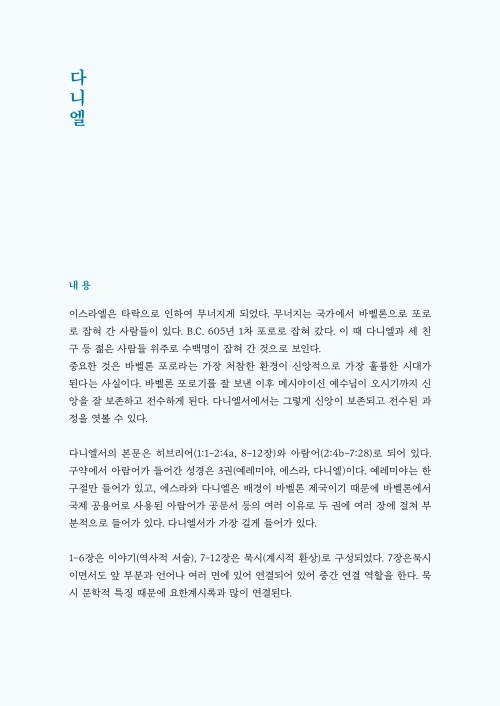 • 다니엘서는 바벨론 포로, 이방의 나라라는 비참한 환경에서 도리어 하나님 나라를 살아가고 준비한 성공적인 모습을 보여준다.