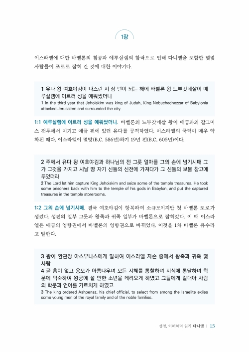 1차 포로로 잡혀 간 사람들 중에는 다니엘과 세 친구가 있었다. 그들의 나이는 아마14세(바벨론에서 궁정에 들어가 교육을 받는 나이) 정도였을 것이다. 왕궁에서 일을 하도록 데려갔다. 아마 내시로서 국가의 일에 지혜를 내는 사람 역할로 키우기 위함 일 것이다. 당시 바벨론 공식 언어인 아람어를 익히고 학문 언어인 아카디아어를 공부하고 바벨론의 신화와 점성술을 배우는 것이 가장 중요한 학문 중에 하나였을 것이다. 일을 하기 전 견습 기간 3년 동안 선진 국가인 바벨론의 문화와 신화와 학문을 배워 그들은 완벽하게 바벨론 사람이 되어 바벨론 국가를 위해 일하도록 동화될 것이다.