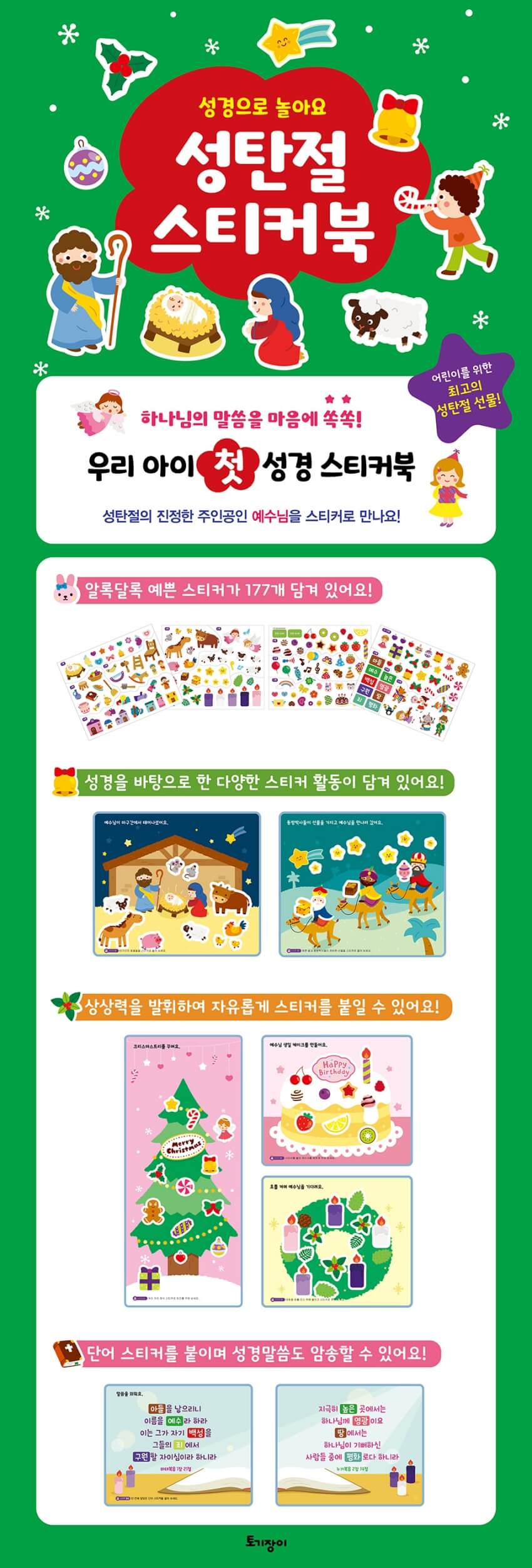 요즘 어린이들은 ‘성탄절’이라고 하면 산타클로스, 루돌프, 크리스마스 선물 등을 떠올립니다. 하지만 성탄절의 진정한 주인공은 예수님이십니다. <성탄절 스티커북>은 아이들이 예수님의 탄생을 따라하며 다양한 스티커 활동을 즐길 수 있도록 구성되어 있습니다. 또한 귀엽고 앙증맞은 스티커가 177개나 담겨 있습니다.