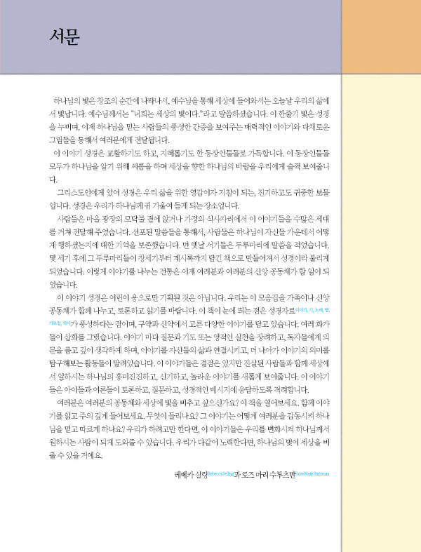 여러분은 여러분의 공동체와 세상에 빛을 비추고 싶으신가요? 이 책을 열어보세요. 함께 이야기를 읽고 주의 깊게 들어보세요. 무엇이 들리나요? 그 이야기는 어떻게 여러분을 감동시켜 하나님을 믿고 따르게 하나요? 우리가 하려고만 한다면, 이 이야기들은 우리를 변화시켜 하나님께서 원하시는 사람이 되게 해 줄 수 있습니다. 우리가 다같이 노력한다면, 하나님의 빛이 세상에 비칠 수 있을 거예요.