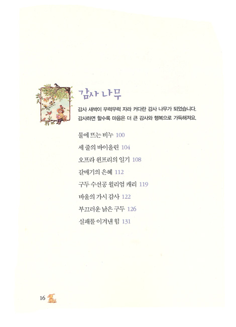 하녀의 욕심 / 다른 사람이 더 행복해 보여요 / 비교하지 마세요 / 과자에 담긴 사랑 / 걱정을 다스리세요 / 누가 상을 받아야 할까요? / 모래단지와 쇳가루 / 소녀의 카드 / 아홉은 어디 있느냐? / 맥클러 박사님의 실험 / 요셉의 감사 / 무지갯빛 감사 / 악어와 사냥꾼