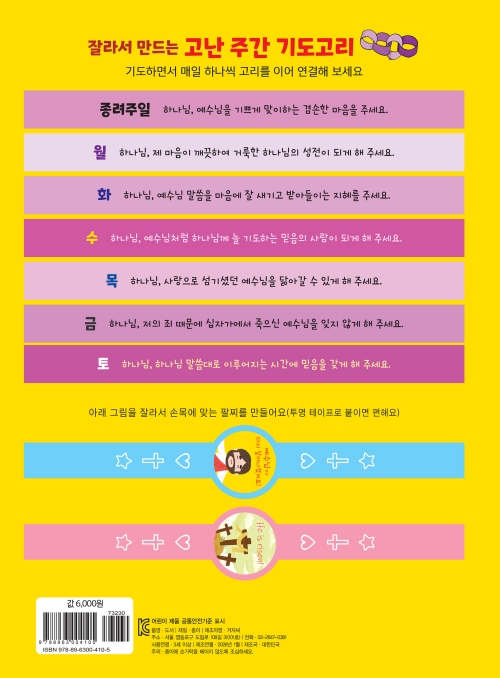 표지 뒷면은 사순절을 보내고 있는 시간을 놓치지 않도록 하루씩 확인하게 하고, 뒷표지는 잘라서 부활의 기쁨을 담은 입체적 활동을 할 수 있게 꾸몄어요.