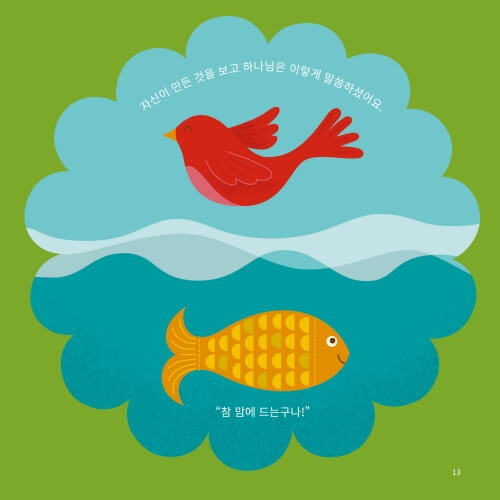 하나님은 말씀하셨어요. “하늘과 물, 땅과 푸른 식물, 해와 달아 생겨나라."