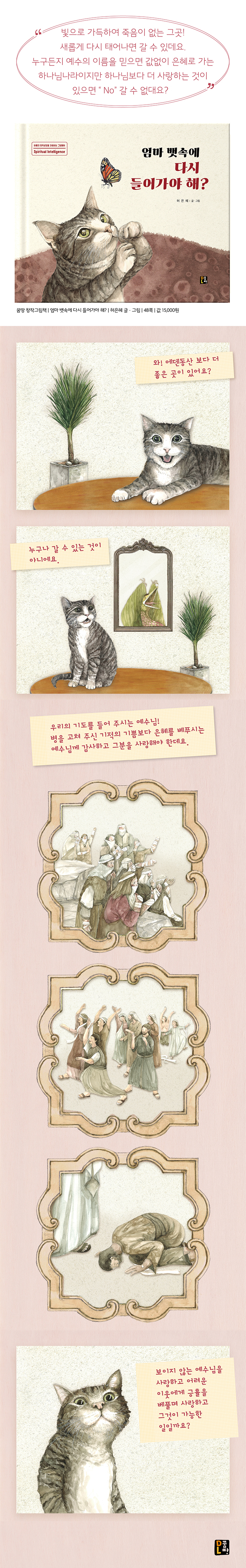 이러한 과정을 고양이 ‘코코’를 통해 잘 설명해 주고 있는 그림책으로 아동의 전 연령에서 소화 해 낼 수 있는 책입니다. 사람들이 어떻게 하나님 나라에 갈수 있는지 그 핵심요소를 잘 그려내고 있습니다.