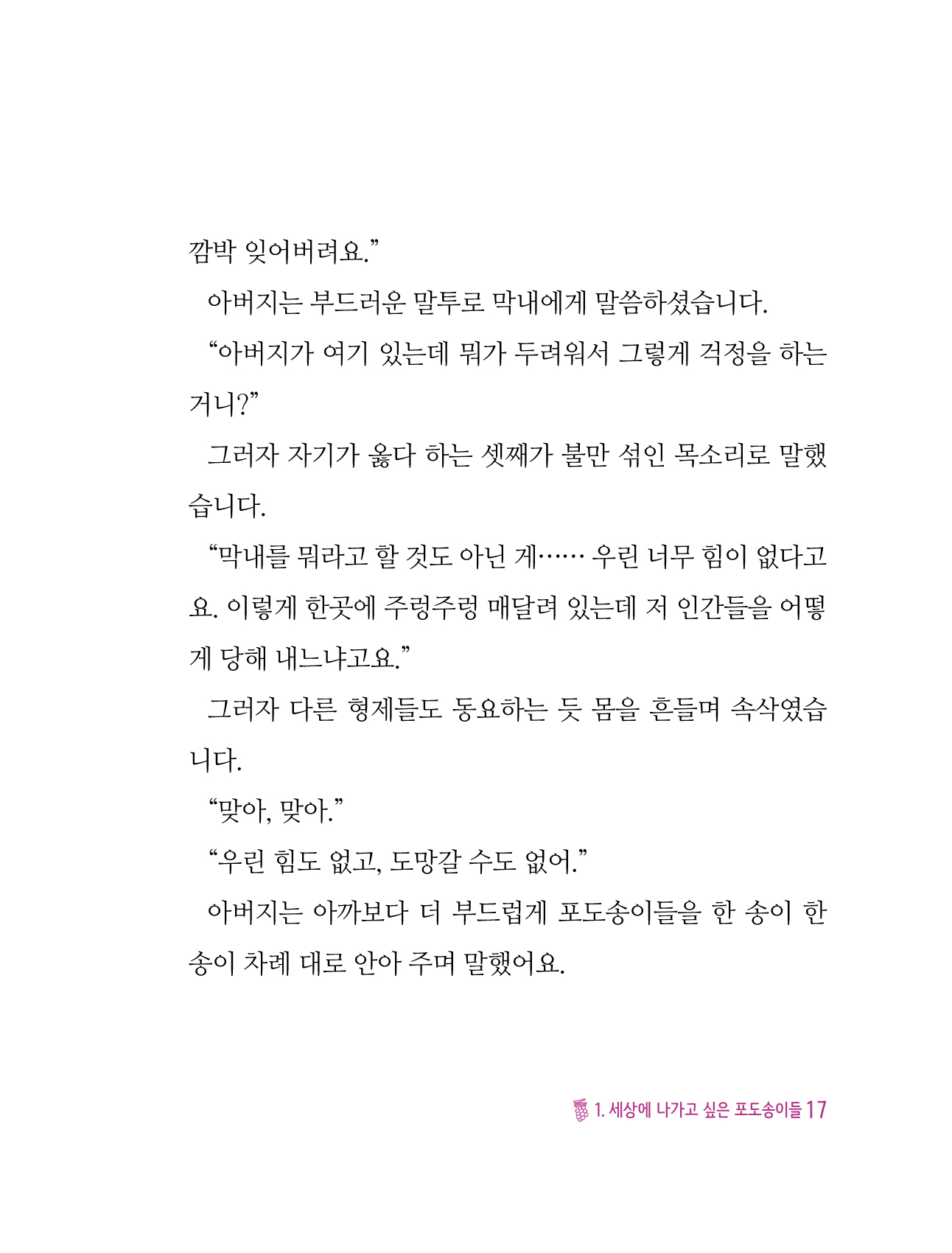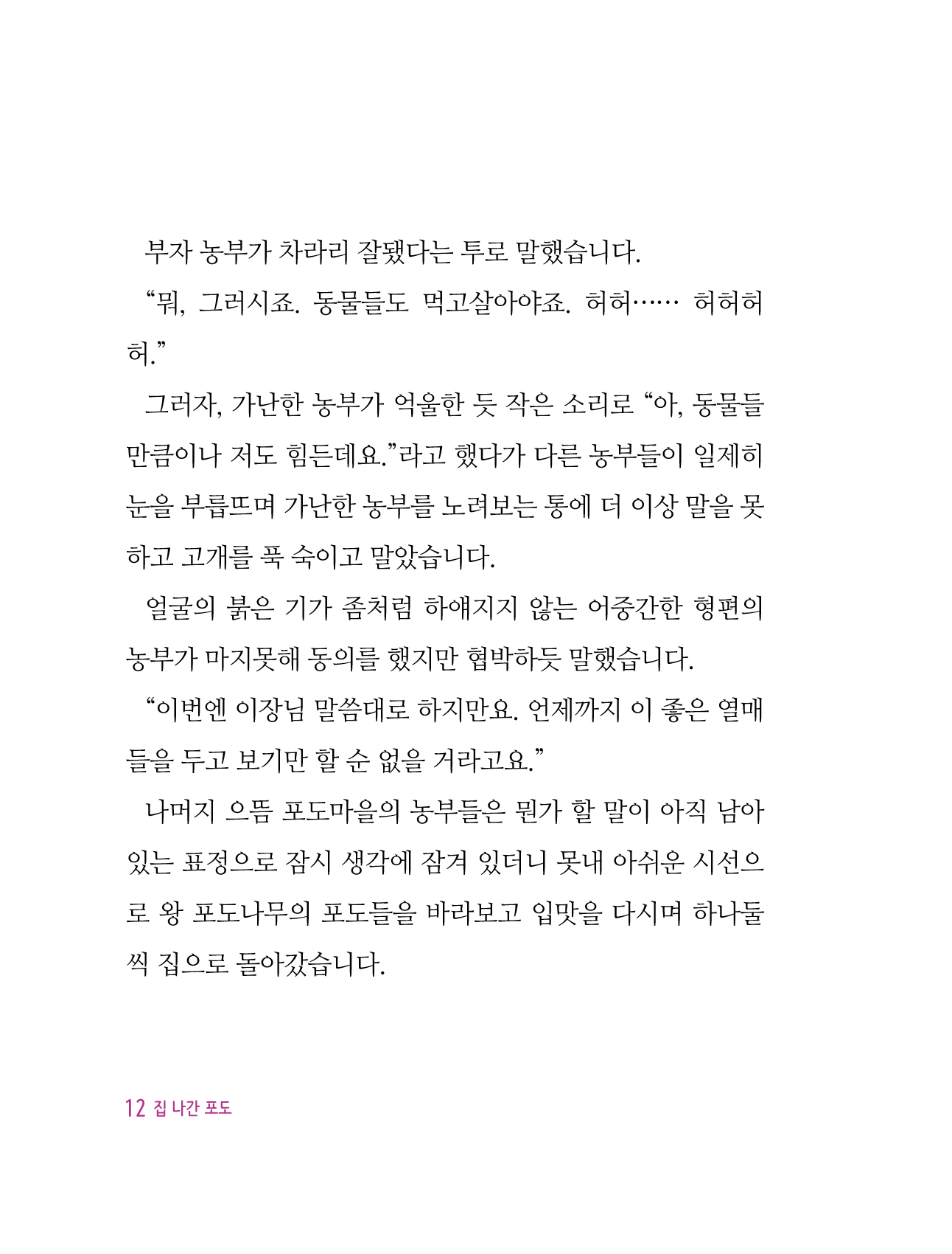 내가 포도들을 통해 감동을 받을 줄 몰랐다. 주인공인 두 포도의 행적을 따라가며 내가 사랑하는 사람들을 떠올렸다. 백 마디 말보다 나의 사랑하는 가족과 친구들에게 이 책을 선물하며 꼬옥 안아주고 싶다.