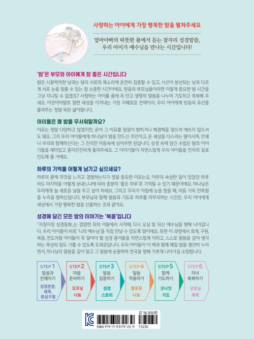 「자장자장 성경동화」는 잠들기 전의 묵상이 다음 날 아침의 삶으로까지 이어지도록 돕기 위해 ‘Night to Day 6 Steps’ 과정을 담았습니다. 한 챕터마다 마련된 6단계를 따라 부모와 자녀가 매일 밤 10분간 마음을 나눌 수 있도록 꾸몄습니다. 부모와 아이는 이 소중한 시간을 통해 서로의 마음을 더 깊게 확인하며 신앙적인 사랑을 나누게 됩니다.