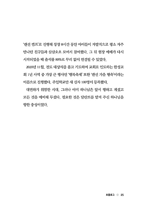 랜선 캠프는, 특히 줌나잇은 내가 지금 하고 있는 이 일이 하나님의 뜻 안에 있다는 확신이 내게 있을 때 나를 둘러싼 상황과 여건은 조금도 장애물이 될 수 없다는 것을 다시금 깨닫게 한 소중한 경험이다. _p. 135